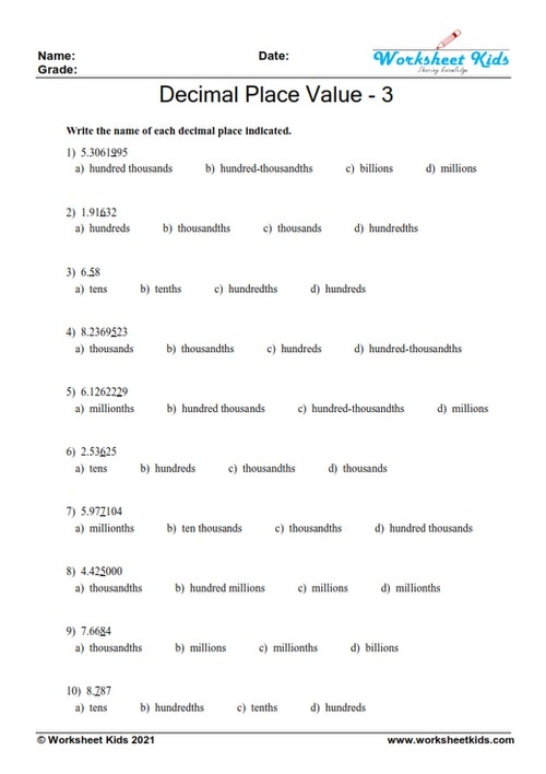 Decimal Place Value Worksheets For 5th Grade Free Printable PDFDecimal Place Value Worksheets For 5th Grade Free Printable PDF