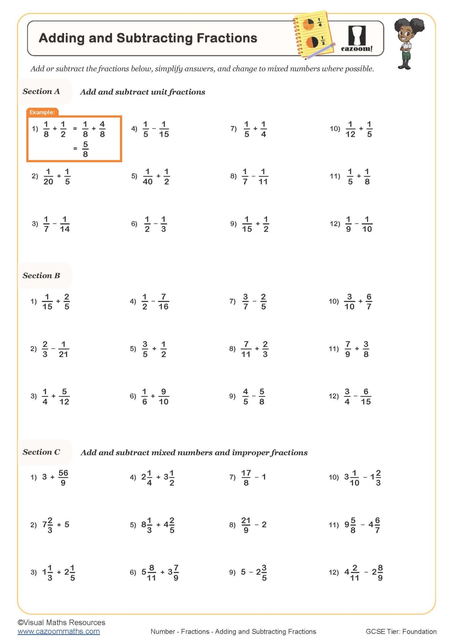 Addition And Subtraction Of Fractions Worksheet Worksheets Library