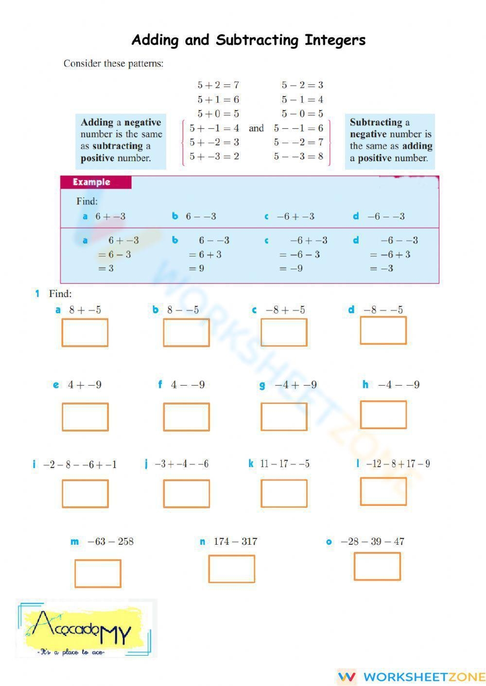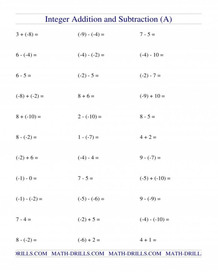 Addition And Subtraction Of Integers Worksheet