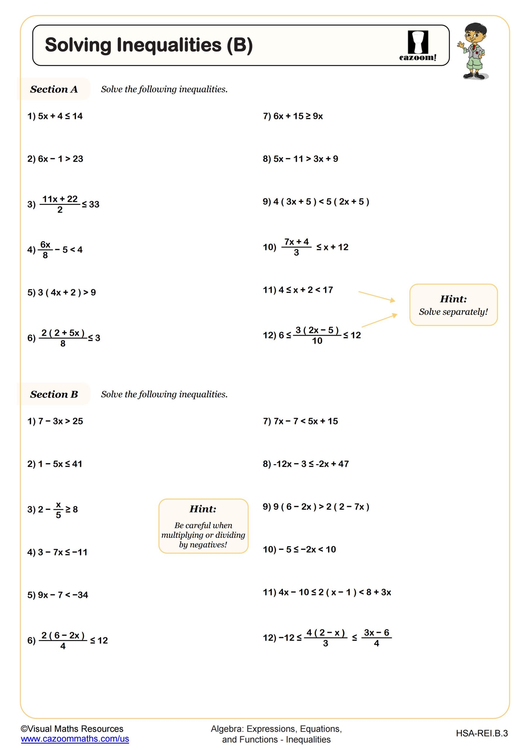 Solving Inequalities B Worksheet PDF Printable Algebra Worksheet