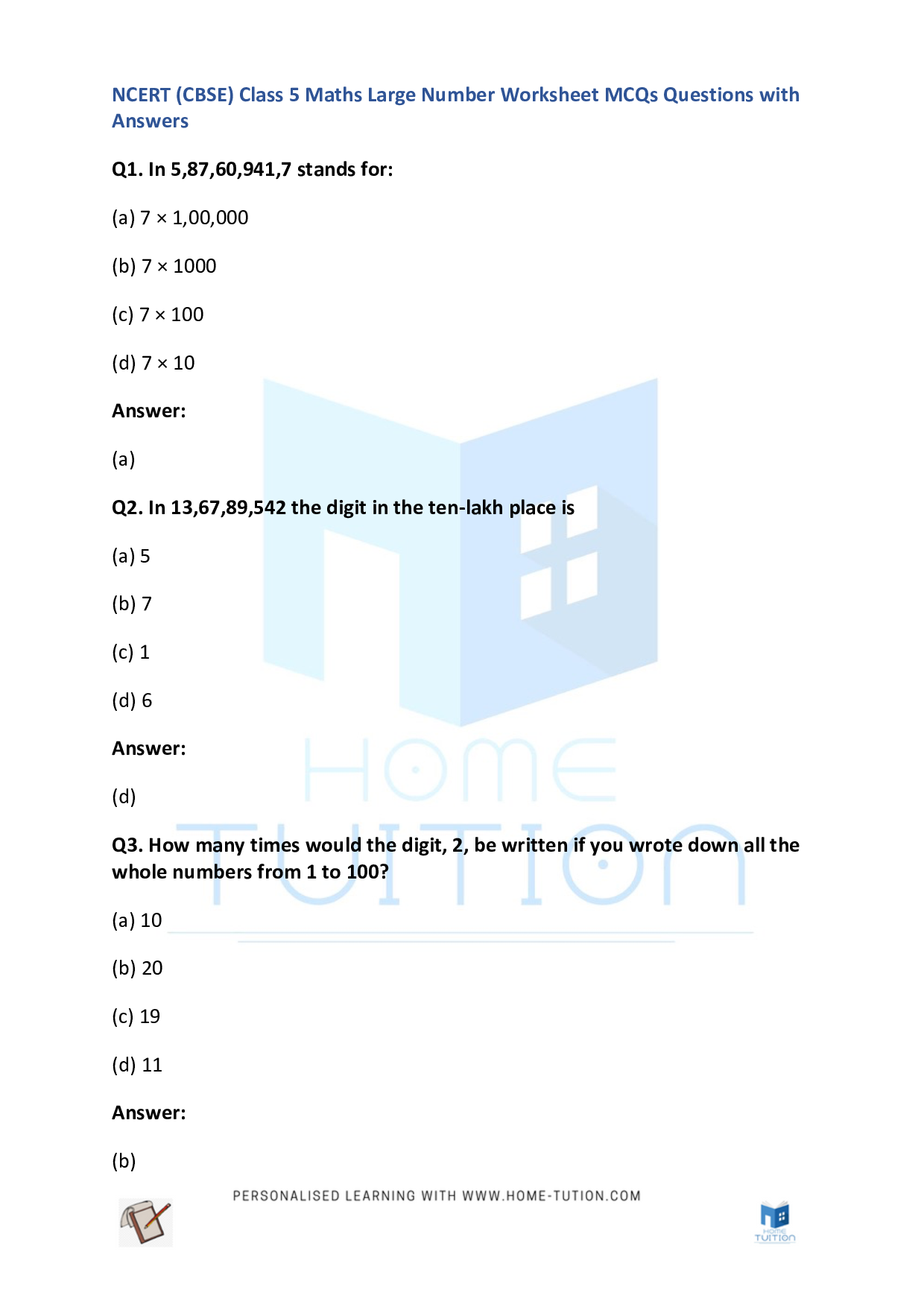 CBSE NCERT Class 5 Maths Large Number Worksheet Free PDF Home Tution