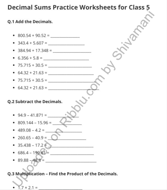 Class 5 Decimal Worksheets Free PDF