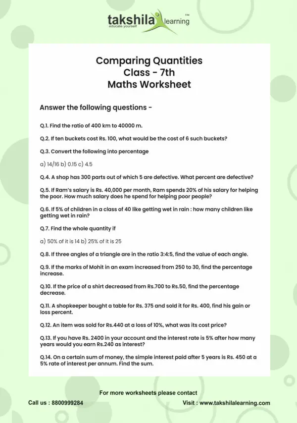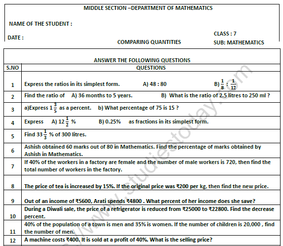 Download and Print Comparing Quantities Class 7 Worksheet Listed below