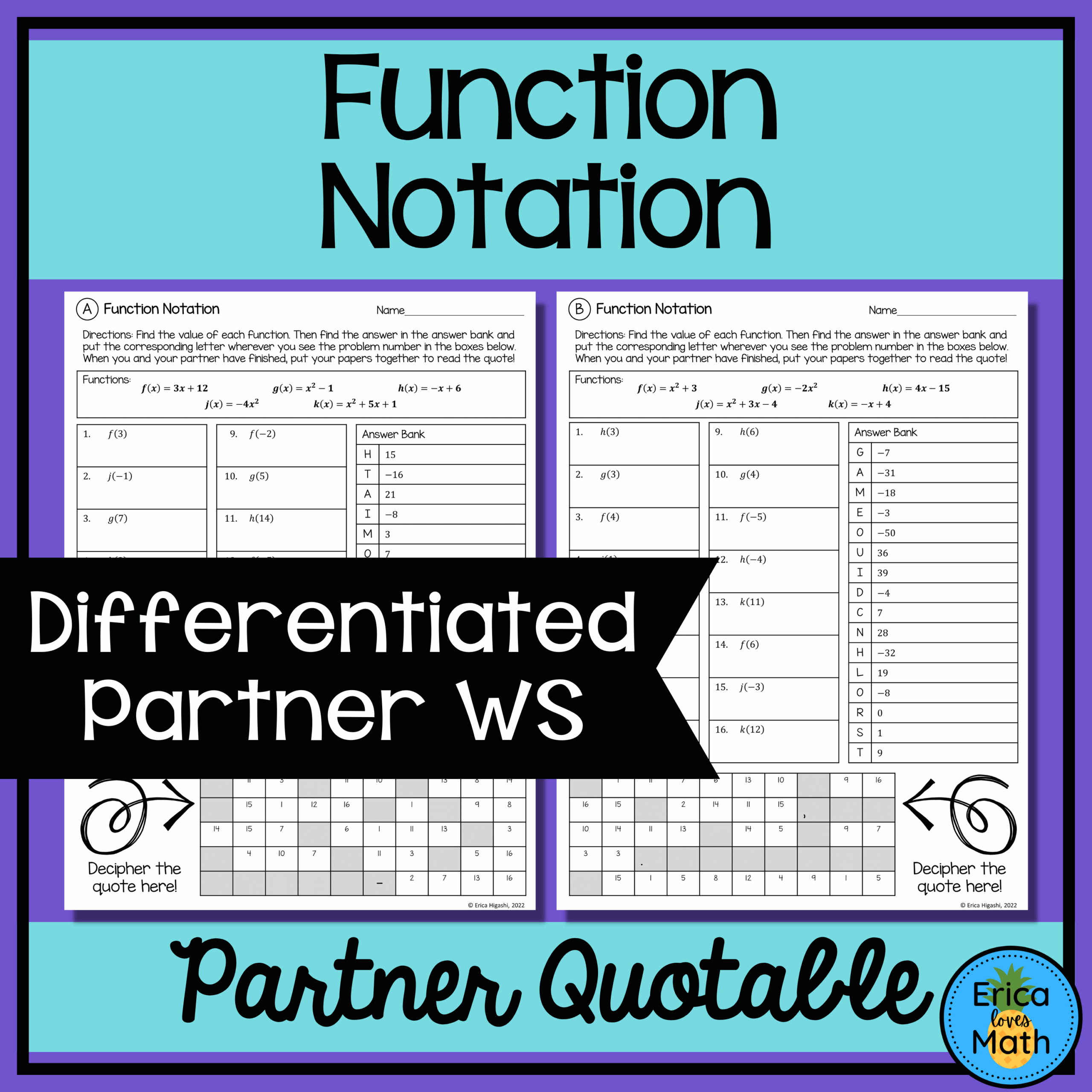 Function Notation Differentiated Partner Worksheets Quotable