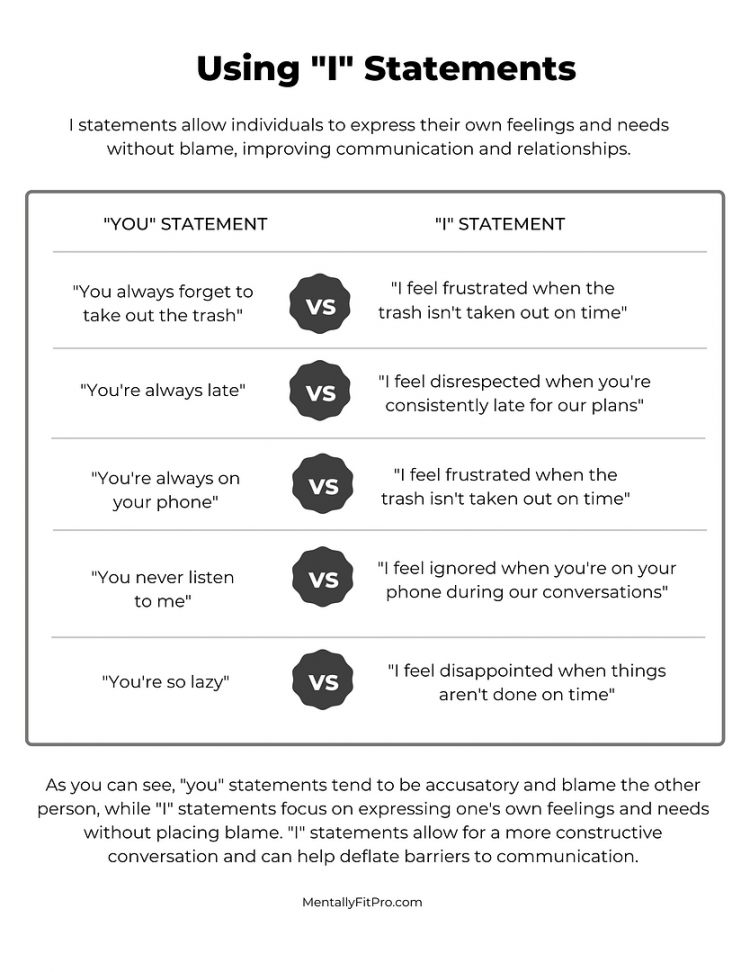 By using “I” statements, you take ownership of your own thoughts and emotions, rather than placing blame or making assumptions about others. This can lead to more positive and productive interactions with those around you, whether at work, at home, or in your relationships.