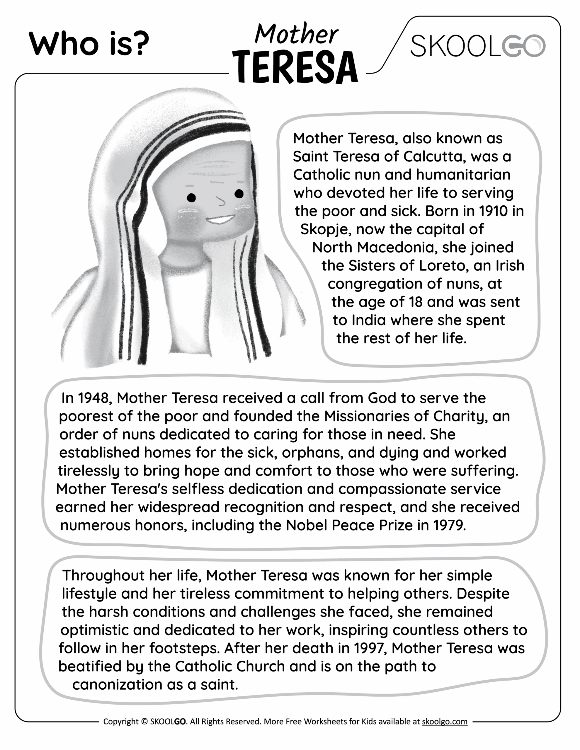 Mother Teresa For Kids Worksheets Worksheets For Kindergarten