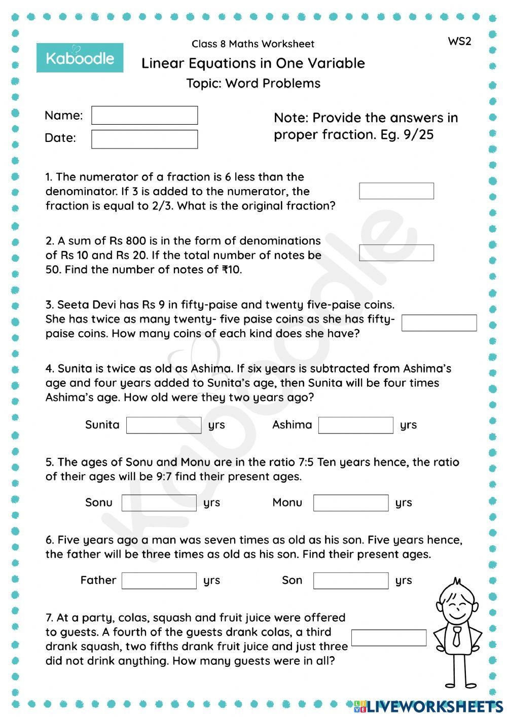 Linear Equation Word Problems Worksheet Grade 7 Linear Equations In One