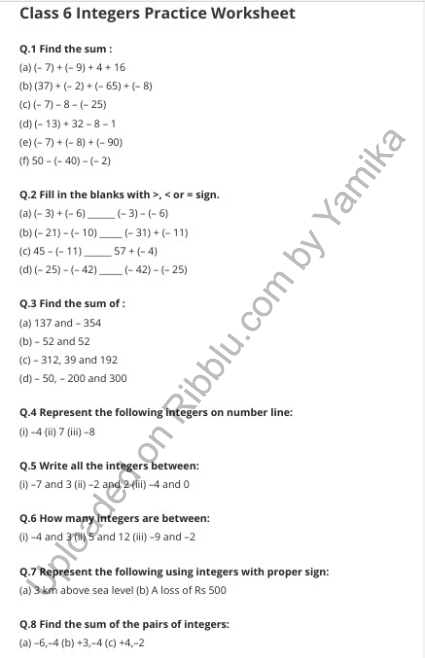Class 6 Maths Integers WorksheetClass 6 Maths Integers Worksheet