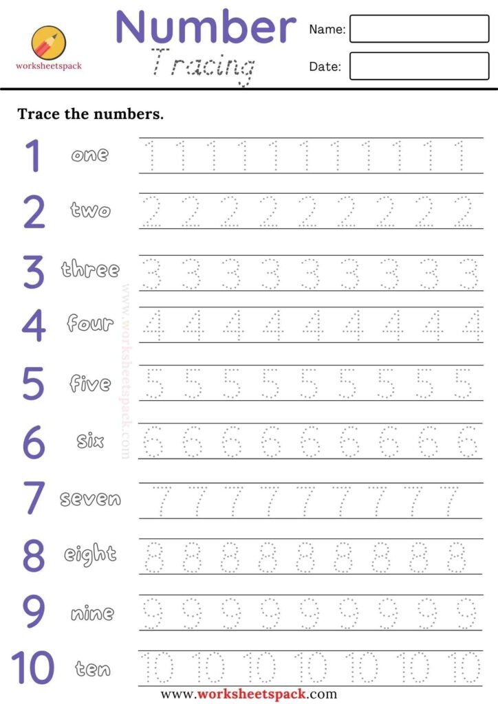Number tracing worksheets are designed to help children practice writing numbers from 1 to 10 or even higher. They typically feature large, easy-to-follow numbers that kids can trace over with a pencil or crayon. This repetitive practice helps reinforce the shape and formation of each number, making it easier for kids to learn and remember.