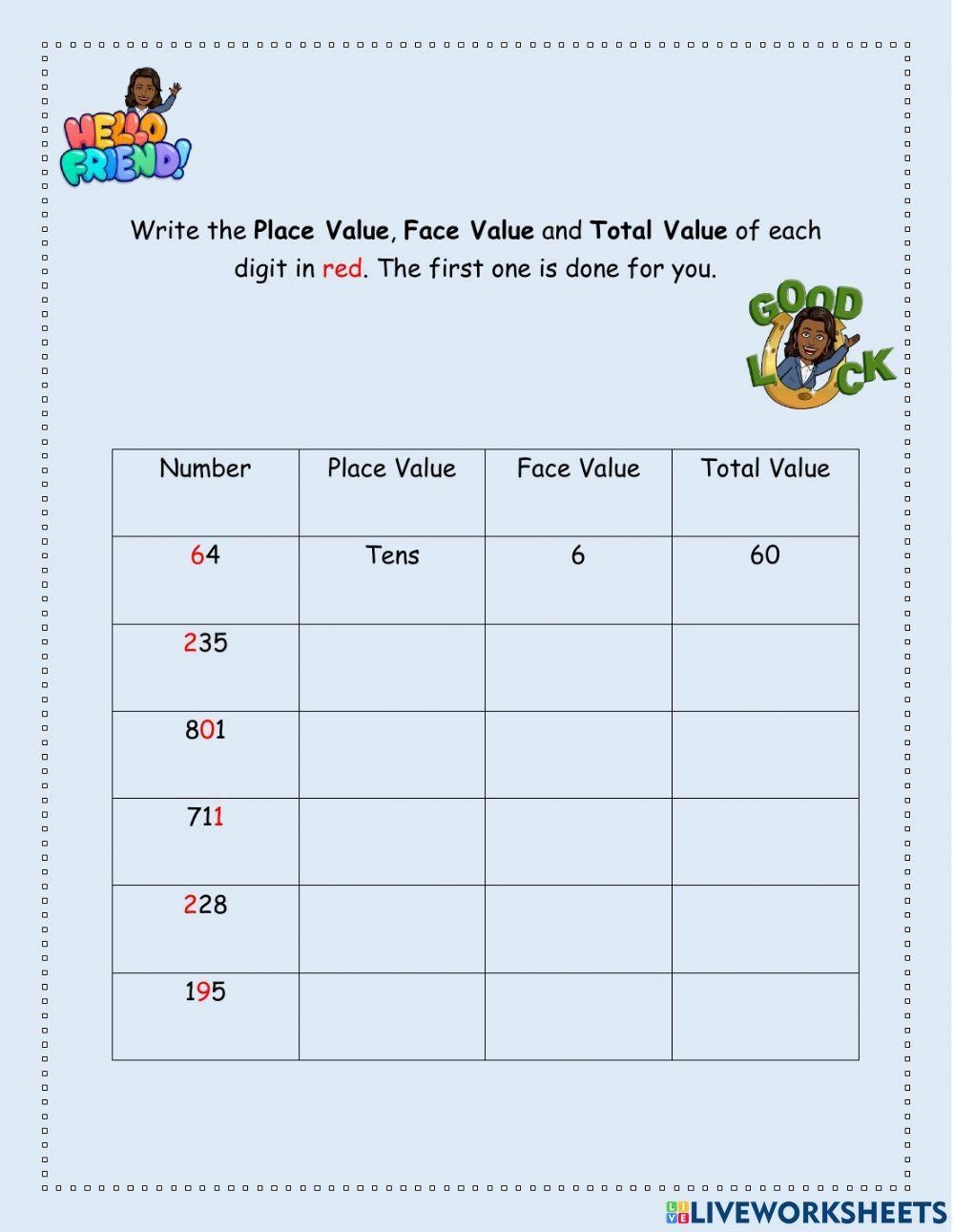 Place Value Face Value And Total Value Worksheet Live Worksheets