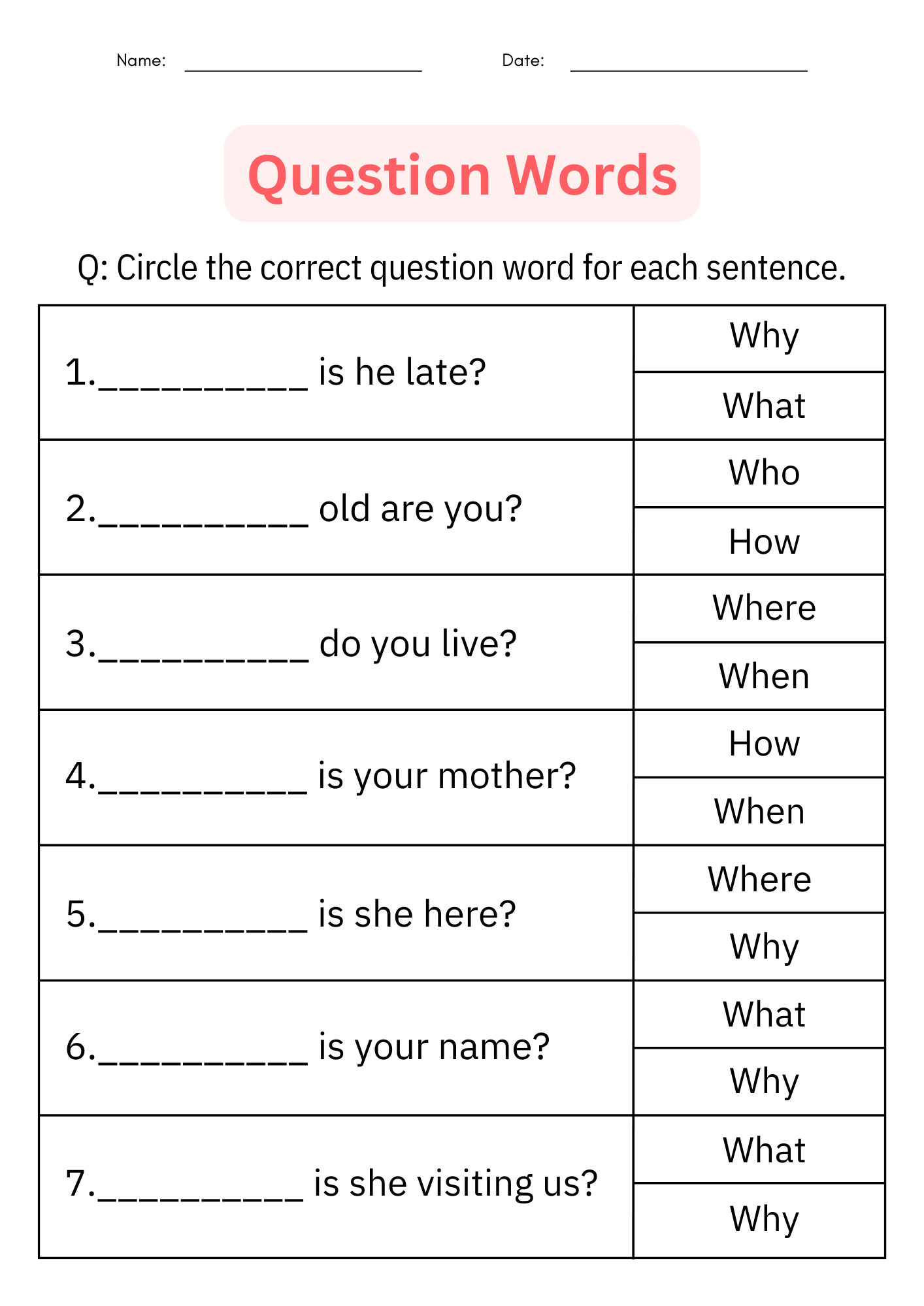 Designed for elementary and middle school students, this worksheet covers the basic question words such as who, what, where, when, why, and how. With a variety of exercises and activities, students will have the opportunity to practice using these question words in context.