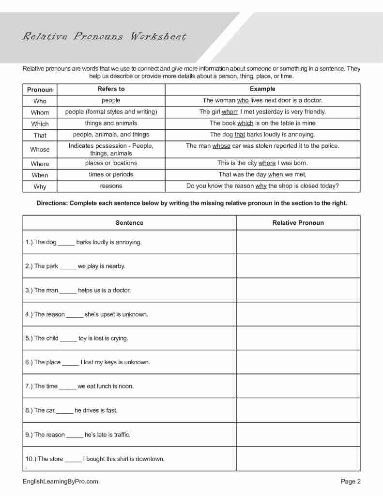 Relative pronouns are words like “who,” “whom,” “whose,” “which,” and “that” that are used to introduce dependent clauses in a sentence. By practicing with a relative pronouns worksheet, students can improve their understanding of how to use these words correctly in context.