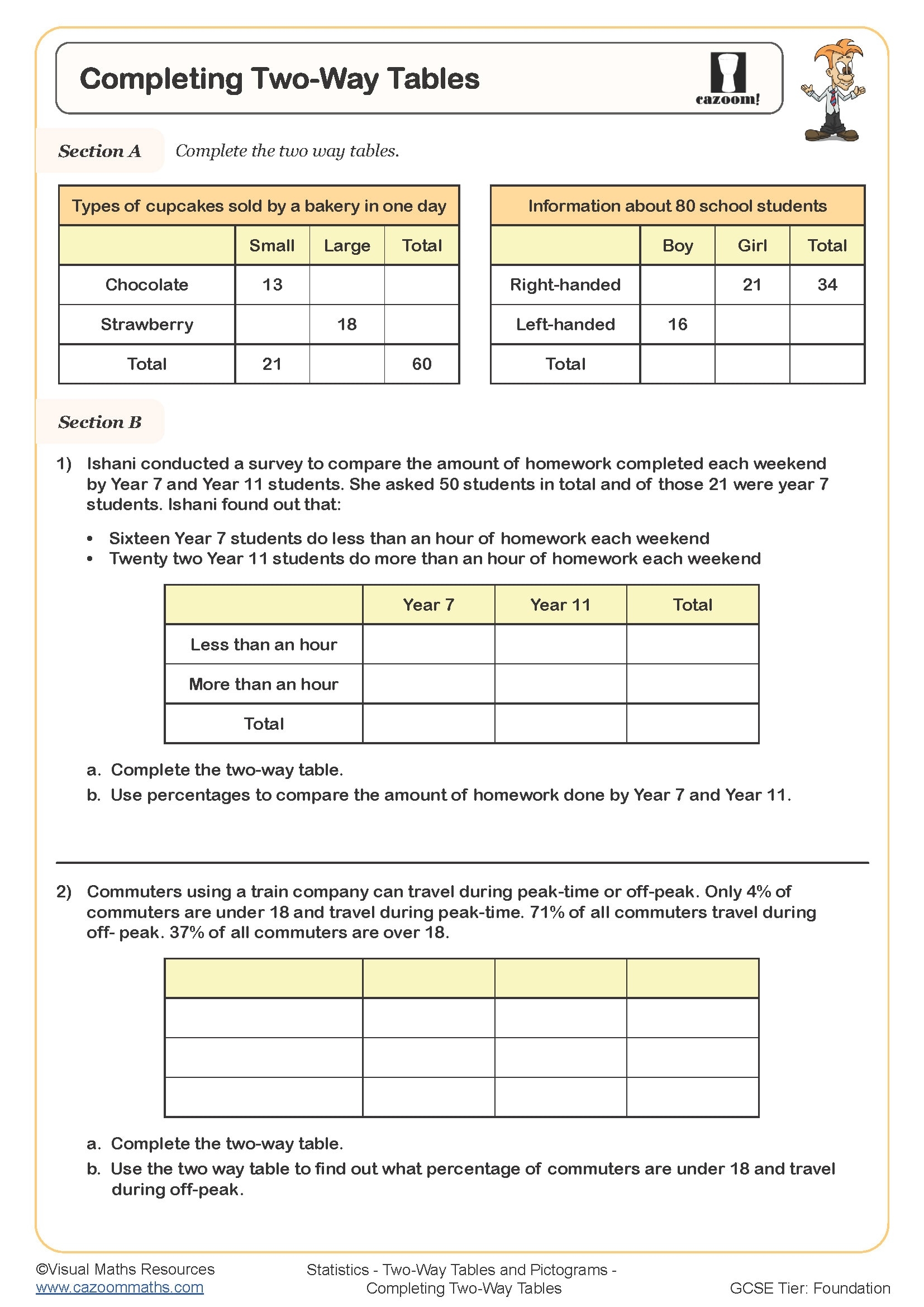 Completing Two Way Tables Worksheet Cazoom Maths Worksheets