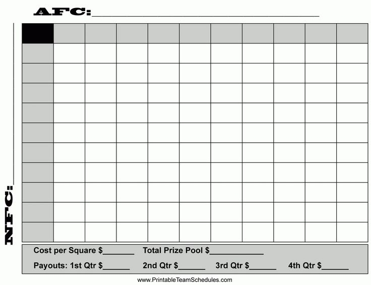 With 100 blank squares to fill in, you can create your own custom pool for any football game. Simply print out the template, write in the numbers 0-9 along the top and side of the grid, and then have participants choose squares to fill in. Once all the squares are filled, randomly assign numbers to each row and column to determine the winner!