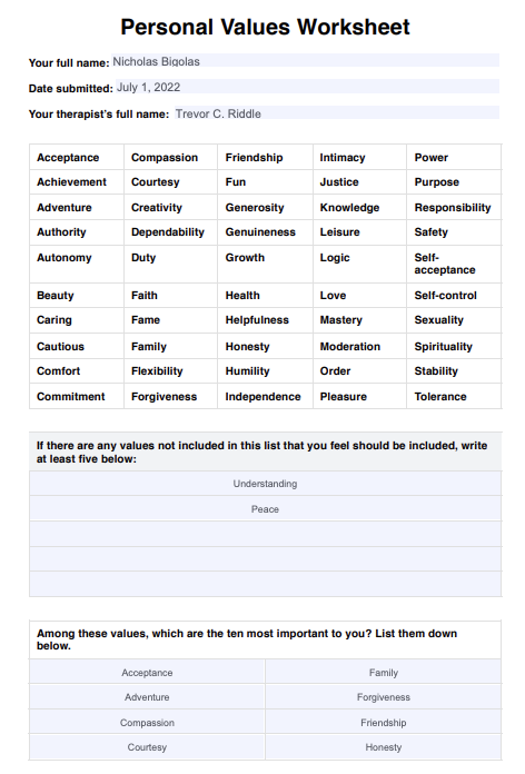 Personal Values Worksheet Example Free PDF Download Worksheets