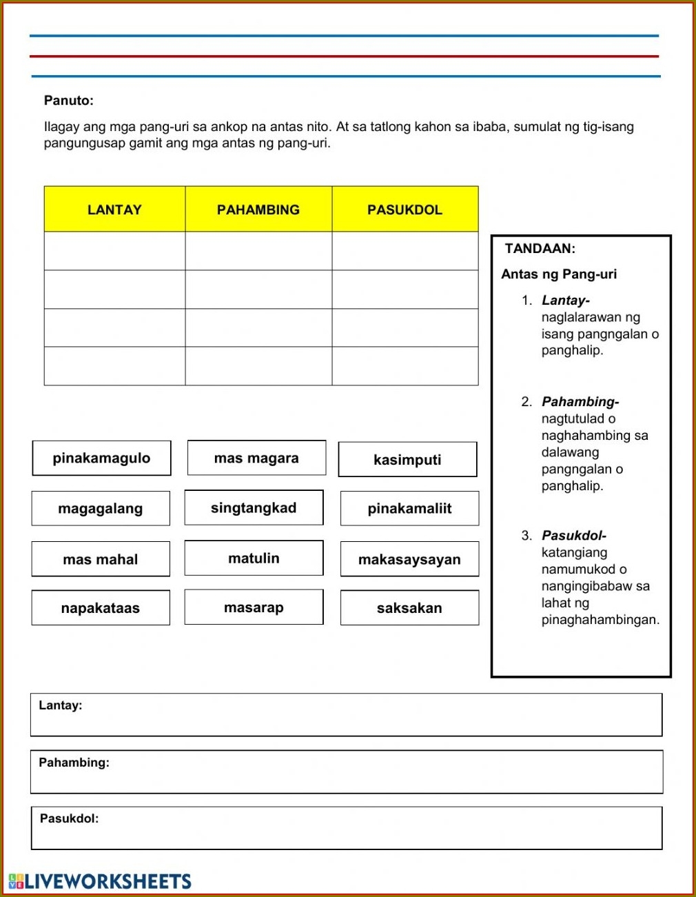 With a variety of exercises focusing on pang-ukol, students will be able to strengthen their understanding of this important grammatical concept. Whether you’re a teacher looking for supplemental materials or a parent wanting to support your child’s learning at home, this worksheet is perfect for you!